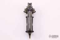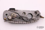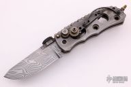 This one of a kind, steam punk style folder, is constructed from acid etched wrought iron from the wheel of an antique freight wagon. The blade is the Makers Damascus using L6 and 1084. All five steel gears are functional and not just glued on for the steam punk look. Four of the gears are part of the lock system unique to this piece. Has eight moving parts. Has a chain back spine what terminates in a bronze spiral unicorn horn spike. To unlock and close the blade, use thumb and index finger to pull the two uppermost gears back. This pivots the spring-loaded arms down and unlocks the blade. Opening is the same as with any thumbstudded knife, but more interesting! New from maker. Comes with a zippered case and COA.