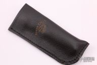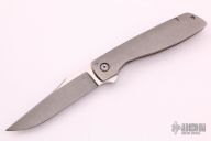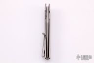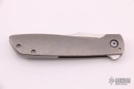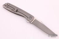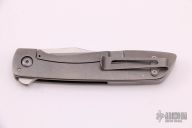 This Dirt Dobber Flipper by Jason Clark features a two-tone blade with a notched flipper. The handle has a tumbled titanium frame, floating stainless steel backspacer, tip up titanium clip. Rides on IKBS, nice detent, lockup and blade seating. Comes with a leather slip sheath. Excellent condition.