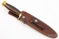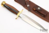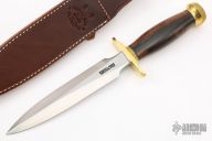 This Model 2-7 by Randall Made knives features a satin finished double edged blade, .221" blade thickness and 1.286" blade depth, hidden tang construction. The Model 2 is a heavily made dagger or dirk. Brass guard and butt, ebony wood grip with black spacers. Comes with a brown leather sheath and original papers. Excellent condition.