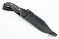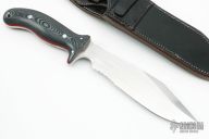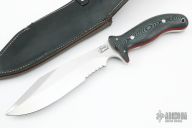 This Field Knife by Lamont Coombs Jr features a hand rub satin finished partially serrated blade with sharpened top edge and notched thumbrest, .220" blade stock and 1.781" blade depth, full tang construction. The handle has black/grey G-10 scales with red G-10 liners. Comes with a black brown leather sheath. Excellent condition.