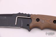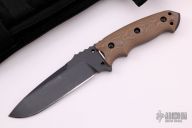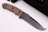 This Hogue fixed blade is an Allen Elishewitz design, it features a black coated drop point blade with swedge and notched thumb rest, .234" blade stock and 1.413" blade depth, full tang construction. The handle is comprised of tan/brown/grey G10 scales over full tang construction with exposed tang glass breaker pommel. Includes nylon sheath and original zippered case. Has som light scuffs/scratches, otherwise good condition.