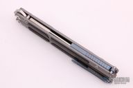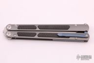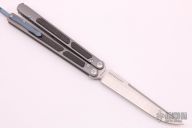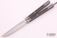 This Balisong by Maxace Knives features a satin finished clip point blade with false top edge. The handle has blasted titanium handles with carbon fiber inlays, anodized titanium backspacers, tip up clip and T-latch. Comes with original box, zippered case with trainer blade and extra hardware. New from maker.