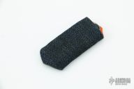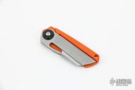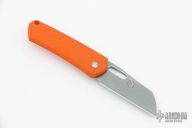 This POD by Nick Chuprin features a tumble finished blade with fuller and thumbhole, chisel ground blade. The handle is orange G-10 with a black G-10 pivot collar. Has lanyard hole at the butt. Comes with denim cloth slip sheath. Excellent condition.