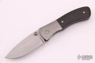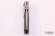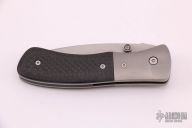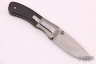 This small Model 2 linerlock folder by Mike Obenauf features a bead blasted drop point blade with notched thumbrest and dual thumbstuds. The handle has bead blast finished titanium bolsters and liners, carbon fiber scales and black backspacer and a tip down stainless steel clip. Smooth action. Nice detent, blade seating and lockup. Excellent condition. Comes with zippered case.