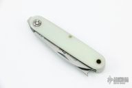 The Handle: A little over a half inch thick in totality, construction consists of durable NifeBrite glowing acrylic and stainless steel liners. All is secured with a brass lanyard tube, pins and steel pivot pin. The acrylic is smooth for a comfortable feel in-hand and will glow in the dark when charged.
