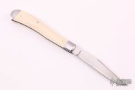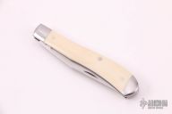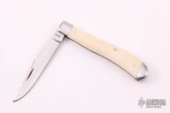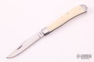 This knife by Jim Dunlap features a hand rub satin finished blade with nail nick. The handle has stainless steel bolsters, mammoth ivory covers, stainless steel liners and spring. Has half-stop, flush in all positions. Comes with a zippered case. Excellent condition.