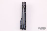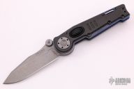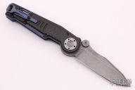 This MUDD folder from Grant and Gavin Hawk features a tumbled drop point blade with dual thumbstud. The handle has carbon fiber scales, anodized titanium frame, tip up reversible titanium clip. Nice lockup and blade seating. Excellent condition.