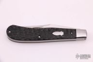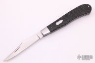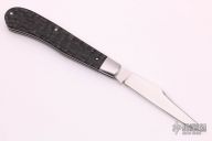 This Slimline Trapper Slipjoint by Dwayne Chancellor features a hand rub satin finished blade with nail nick. The handle has stainless steel bolsters and liners, CPM154 steel spring and jigged black paper micarta covers with a stainless steel escutcheon. Has half-stop, flush in all positions. New from maker.