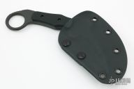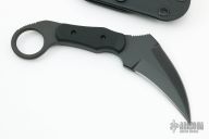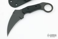 This Karambit by Crawford Knives features a DLC coated double edged blade with notched thumbrest, .193" blade stock and 1.485" blade depth, full tang construction with black G-10 scales. Comes with a kydex sheath. New from maker.