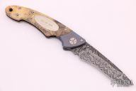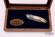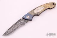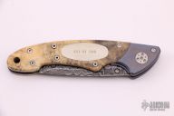 Browning made in Italy 125th Anniversary Damascus folding knife 1878-2003. 8″ long opened with a 3 1/2″” blade. Number 451 of 500. Comes mounted in a wooden and glass display case. The handle has anodized titanium bolsters and liners, wood scales. Has some light scuffs, otherwise excellent condition.