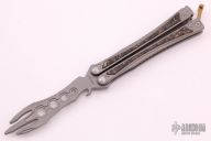 This Balisong is a collaboration between from Maxace & Midnightcat Studios.  This knife features a bead blasted trident style trainer blade. The handle features bead blasted titanium frames with copper powder carbon fiber inlays.  Includes a satin finished double-edged blade, original padded zippered case and a microfiber.  New from maker.