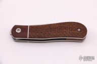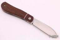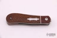 This Dogleg Front Flipper by Enrique Pena features a hand rub satin finished drop point blade with a notched thumbrest and front flipper. The handle has brown canvas micarta bolsters, brown burlap micarta scales over white liners, natural canvas micarta backspacer.  Stainless steel shield. Includes padded zippered case. New from Maker.