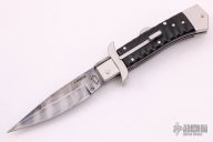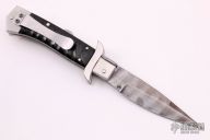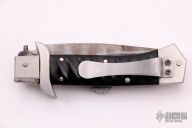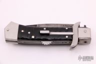 This Picklock Auto by Antonio Contini features an antique finished blade with false top edge. The handle has stainless steel bolsters, fittings and liners with textured black scales. This one has a rolling safety on the spine of the handle and a tip up stainless steel clip. Nice action and lockup. Excellent condition.