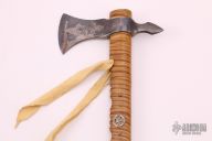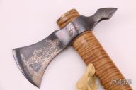 This tomahawk was made in 1974 as a gift for Sid Latham. The Knifemakers Guild was just founded, so Bob Loveless asked RW to write a book about knifemakers. RW was busy with a gun book, so he asked Sid Latham if he would write about "Knives and Knifemakers". He did and that's what he named the book. Because Sid helped RW by writing the book, RW made this tomahawk as a gift.