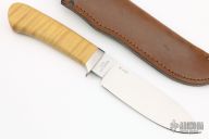 This John Fitch Large Drop Point Hunter by Browning Knives features some really nice looking stabilized and contoured light curly maple wood handle with stainless steel guard. Satin finished high carbon steel drop point hunting blade that is laser etched BROWNING FITCH - 82 OF 500 MODEL 575 U.S.A. This knife is serial numbered #82 of only 500 made. “Big” John Fitch brings a natural talent to the knife making industry. He teaches knife making at “Hammer-ins” for the ABS across the country, and finished second at the 2003 annual ABS World Championship Cutting Competition and third in 2004. John takes great pride in the continual learning process of his craft and in his ability to make functional knives. Comes with a brown leather sheath and original box. Excellent condition.