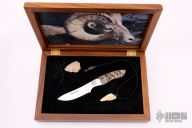 This is a limited edition Browning "Full Curl Series" knife. The knife features, dovetailed stainless steel engraved bolsters, sheep horn scales. Has a mirror polished blade with full tapered tang construction. The knife comes in a solid wood presentation box. The knife is in new, unused, excellent condition. Comes with original artwork.