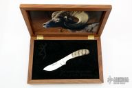 This is a limited edition Browning "Full Curl Series" knife. The knife features, dovetailed stainless steel engraved bolsters, sheep horn scales. Has a mirror polished blade with full tapered tang construction. The knife comes in a solid wood presentation box. The knife is in new, unused, excellent condition. Comes with original box and artwork.
