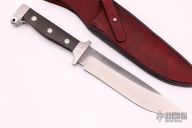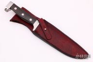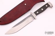 This Combat Bowie by McMillan International Group features a hand rub satin finished blade with black flats, .218" blade stock and 1.565" blade depth, full tang construction. The handle has stainless steel bolsters and carbon fiber scales, stainless steel rear bolsters. Comes with custom brown leather sheath. B-side of blade says "SAUER". Excellent condition.