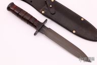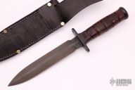This Dagger by Barry Dawson features a black double edged blade with .241" blade stock and 1.276" blade depth, hidden tang construction. The handle has a black steel guard with stacked leather handle and a black steel butt. Comes with a black leather sheath. Excellent condition.