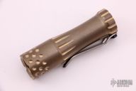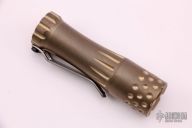 This Malihini Flashlight is a collaborative effort between Joshua Dawson and Mitch Lum. It features bronze construction with dimpling and fluting. The dimpled titanium pocket clip features a tumble finish. Red rubber clicky switch on tail cap. Includes COA. Specs: Driver Dragon Red. Emitter: Triple 219C 4000K. Optic: Carclo. Window: Flat Sapphire Watch Glass. Battery: Single 18350.  New from maker.