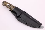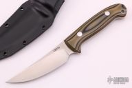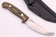 This skinner from Dan Crotts features a satin finish upswept blade. .128" blade stock and 1.129" blade depth. The handle features G-10 scales with aluminum pins and lanyard tube over a full tang construction. Includes kydex sheath with belt loop set up for vertical carry. New from maker.