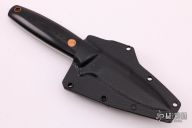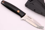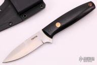 This knife from Dan Crotts features a satin finish spear point blade. .126" blade stock and .855" blade depth. The handle features black micarta scales over tan liners and copper pins and lanyard tube over full tang construction. Includes kydex sheath with belt loop set up for vertical carry. New from maker.
