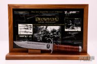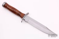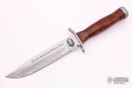 This knife is a commemorative for John M. Browning Military Guns. It features a bead blasted blade with .177" blade stock and 1.250" blade depth, hidden tang construction. The handle has a stainless steel guard and butt with stacked leather grip and black spacers. Comes with wooden display stand. Excellent condition.