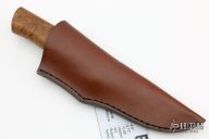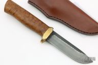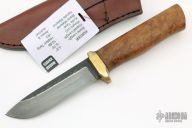 This Hunter by Murad Custom Knives features a drop point blade with nice hamon and forge finished flats, .243" blade stock and 1.175" blade depth, hidden tang construction. The handle has a textured brass guard and a teak burl wood grip. Comes with a brown leather sheath and COA. New from maker.
