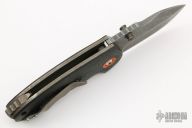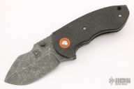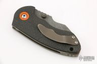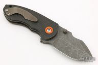 This Porky linerlock from Michael Burch features an acid washed/tumbled blade with swedge and dual thumbstud. The handle is comprised of scratch and tumble finish bronze anodized titanium liners and backspacer, textured carbon fiber scales, orange g10 pivot collars. The pocket clip is also bronze anodized and positioned for tip up carry. Blade is centered when closed and locks up with no movement. Comes in a padded/zippered case. Has a couple scuffs and scratches on the blade and clip, otherwise great condition.