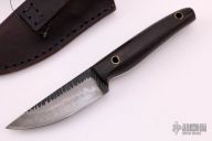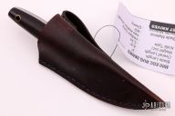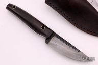 This knife by Last Knives features a drop point blade with Choji hamon and textured flats, .174" blade stock and .893" blade depth, full tang construction. The handle has ebony wood scales with brass pins. Comes with a leather sheath and COA. New from maker.