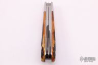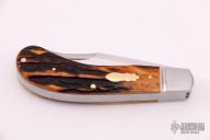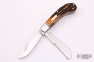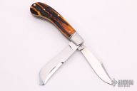 This Model 36B Cowboy Saddle Horn Trapper by Tommy Overeynder features 2 hand rubbed satin finished blades with nail nicks. The handle has 416 stainless steel fluted bolsters with integral liners, stainless steel springs, amber RJB jigged covers with 18k gold pins and escutcheon. Has half-stops and springs are flush at all positions. Comes with a black leather case. Has a few fine scratches on the spring, and escutcheon otherwise excellent condition. #001