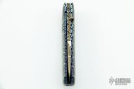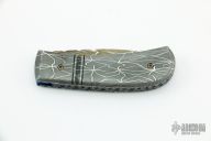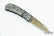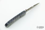 This sole authorship liner lock folding knife by Don Hanson III features a Damascus blade with a single thumbstud. The handle features fluted/pinched/threaded mosaic Damascus faux bolsters and scales, anodized titanium liners with Damascus backspace with filework. Nice detent, lockup and blade seating. Excellent condition. Includes a padded case.