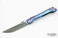 The Onna-Bugeisha (OB) Flipper is sleek and simple, but with a complex 6 face grind with fuller.  It is a modern take on your soldier’s pocketknife.  It is a pleasure to hold and use.  The Blade is M390 high grade knife steel and the handles are smooth flamed Titanium. Comes with original box. New from maker.