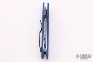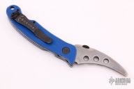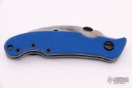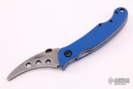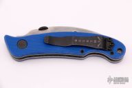 This Elvia Trainer Prototype by Emerson Knives features a satin finished hawkbill trainer blade with thumbdisc. The handle has blue G-10 scales, titanium liners and a black stainless steel tip up clip. Comes with original box. Excellent condition.