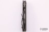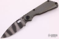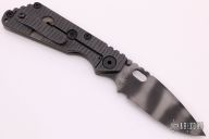 This SNG framelock folder by Mick Strider features a stonewashed blade and a dimple pattern black/grey/green G-10 and flamed titanium frame and tip up titanium clip. Includes a "Lock Bar Stabilizer" for maximum reverse lock retention. Nice detent, lockup and blade seating. New condition.