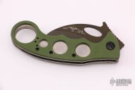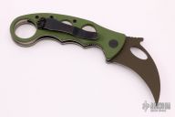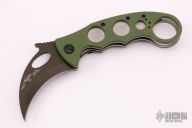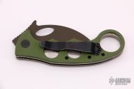 This Emerson Karambit has a black hawkbill chisel grind blade with notched thumbrest, thumbhole and wave feature. Handle is G10 with titanium liners, and black tip up Stainless Steel clip, left or right reversible . Excellent condition. Comes with original box.