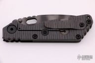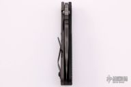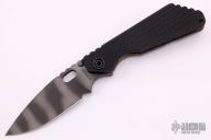 This SNG framelock folder by Mick Strider features a tiger stripe blade and a dimple pattern black aluminum and flamed titanium frame and tip up titanium clip. Includes a "Lock Bar Stabilizer" for maximum reverse lock retention. Nice detent, lockup and blade seating. New condition.