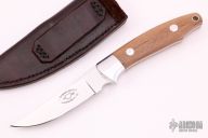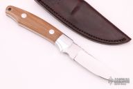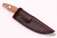 This fixed blade by Jim Downs features a mirror polished blade with fileworked thumbrest, 0.134" blade depth and .932" blade depth, full tang construction. The handle has aluminum bolsters, lignum vitae scales. Includes a brown leather sheath with belt loop, not original to the knife, but fits nicely. Has some light scratches, otherwise excellent condition. Comes with a zippered case.