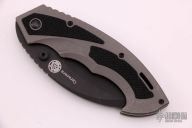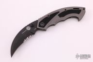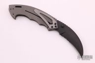 This Caracara by Masters of Defense features a DLC coated hawkbill blade with notched thumbrest and dual thumbstuds. The handle is bead blasted titanium with black G-10 inserts and a bead blasted titanium clip. Light scuffs and scratches are visible on the blade and handle otherwise the knife is in good condition.