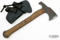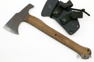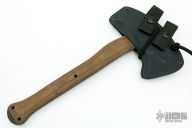 A combination tool developed for Military and Law Enforcement use, the WK Combat Axe is made for breaching and combat applications. The user has easy access with a fast draw carrier. An integral glass breaker extends beyond the end of the handle. The WK Hammer Combat Axe is basically the same axe as the WK Combat Axe, but with a hammer pole rather than a spike. It is a great woodcraft or field axe or performs well as a breaching axe when hammering is part of the operation. Axe Specifications Axe steel: 80CrV2 Black oxide no-glare finish Head length: 5 7/8" Overall length: 13 3/4" Blade thickness: 3/8" Skeletonized full tapered tang Integral Glass Breaker Hammer version Sheath Fast draw carrier Lined Kydex® HD shockcord quick-release retention system Nylon belt straps with Mil-Spec Pull-The-Dot™ snaps Designed for multiple carry options. Has been used. Has some wear on the blade, otherwise good condition. This tool has lifetimes of use left in it!