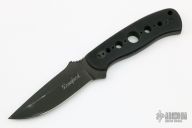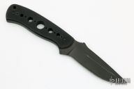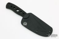 This knife by Crawford Knives features a black drop point blade with notched thumbrest, .139" blade stock and .923" blade depth, full tang construction with black linen micarta scales. Comes with a kydex sheath. Has some wear on the blade finish and some sheath scratches, otherwise good condition.