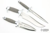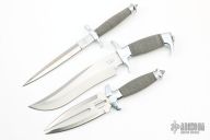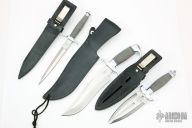 Three United Cutlery Gil Hibben knives. All have black leather sheaths. Has some light scratches, otherwise good condition overall.