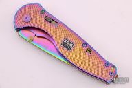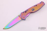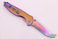 This assisted opening knife by SOG features a rainbow-colored drop point blade with dual thumbstuds.  The handle features a textured anodized aluminum construction with a matching tip up steel pocket clip.  Includes the original box and papers.  Excellent Condition.