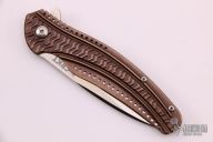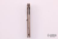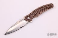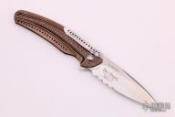 This Ken Onion Design flipper by Columbia River Knife and Tool features a satin finished partially serrated blade with notched thumbrest and flipper. The handle is bronzed stainless steel with a tip down stainless steel clip. Nice detent, lockup, action and blade seating. Excellent condition.