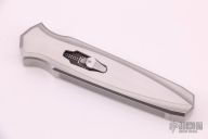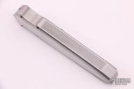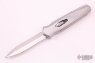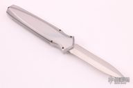 This Triton II OTF Auto by Jeffrey Harkins features a hand-rub satin finish CPM154 CM double edged dagger blade. The handle has a two tone 416 stainless steel frame with bead blasted finish, satin flats, and polished milled stainless steel thumbslide. 2mm sapphire inset in button. Excellent work. Comes with hard-case and provenance papers. Has some light scuffs and scratches (handling marks) on flats of the frame -both sides-, hardware shows some oxidation. Otherwise excellent condition.