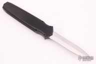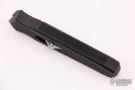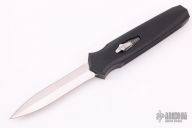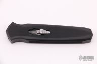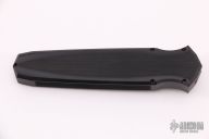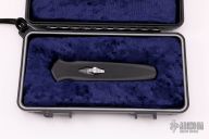 This Triton II OTF Auto by Jeffrey Harkins features a hand-rub satin finish CPM154 CM double edged dagger blade. The handle has a two tone 6061-T6 Aluminum hard anodize finish frame with bead blasted, satin flats, and polished milled stainless steel thumbslide. 2mm sapphire inset in button. Excellent work. Comes with hard-case and provenance papers. Has one scratch on the satin flats of the bottom of the knife, very light oxidation on the hardware. Excellent condition.
