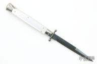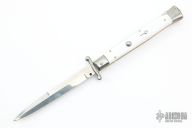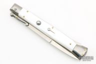 This 11" Swing Guard Auto by Frank Beltrame features a polished dagger/bayonet ground blade with false top edge. The handle has stainless steel bolsters, front and rear, pearl scales, brass liners, stainless spring. Excellent Condition.