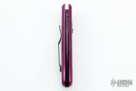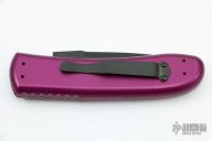 This Airwolf by Roton Knives features a spear point two-tone blade with a false top edge. The handle has a purple aluminum frame with a safety and a black steel tip down pocket clip. Has some light scratches on the handle otherwise the knife is in excellent condition.