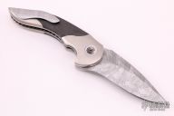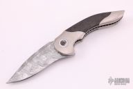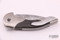 This Aesir Linerlock Flipper by Glenn Are Hovin features a Damasteel blade with false top edge and flipper. The handle has eggshell finished titanium bolsters with Damasteel pivot collars, custom milled pivot, marble carbon fiber scales, satin finished titanium liners with jeweled interiors, tip up Damasteel clip with hidden screws, floating Damasteel backspacer. This knife's only hardware visible is the pivot, every other screw on the knife is hidden, pretty impressive and clean. Nice detent, lockup and blade seating. Comes with zippered case. New from maker!