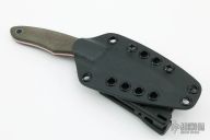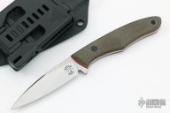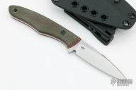 This Ultimate Caper by Tom Krein features a satin finish blade with notched thumbrest, .099" blade stock and .739" blade depth, full tang construction. The handle has green canvas micarta scales with black linen micarta pins and red liners. Includes kydex sheath with Tek Lok. New from maker.